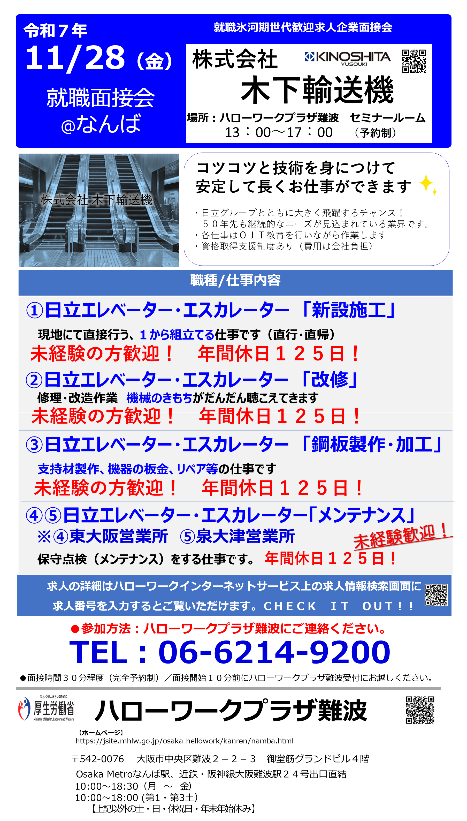 木下輸送機様 面接会20251128_1 木下輸送機様 面接会20251128_2 ハローワークプラザ難波は、こちら 木下輸送機のInstagramは、こちらから